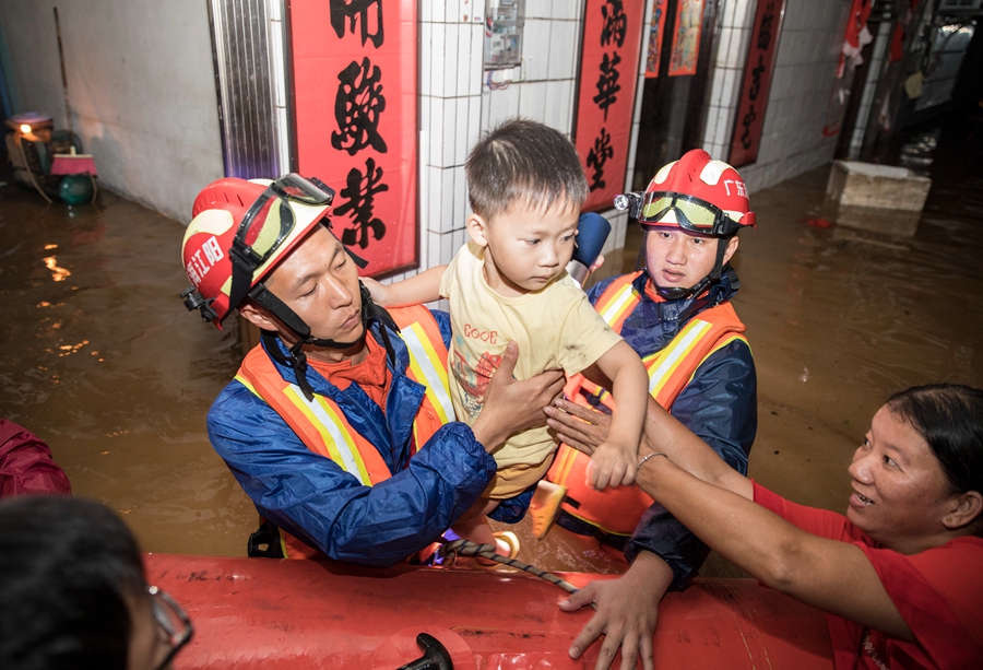 ????9月17日夜晚,陽江陽春市,消防戰士從被洪水圍困的房子里解救出一名兒童,放上救生艇。