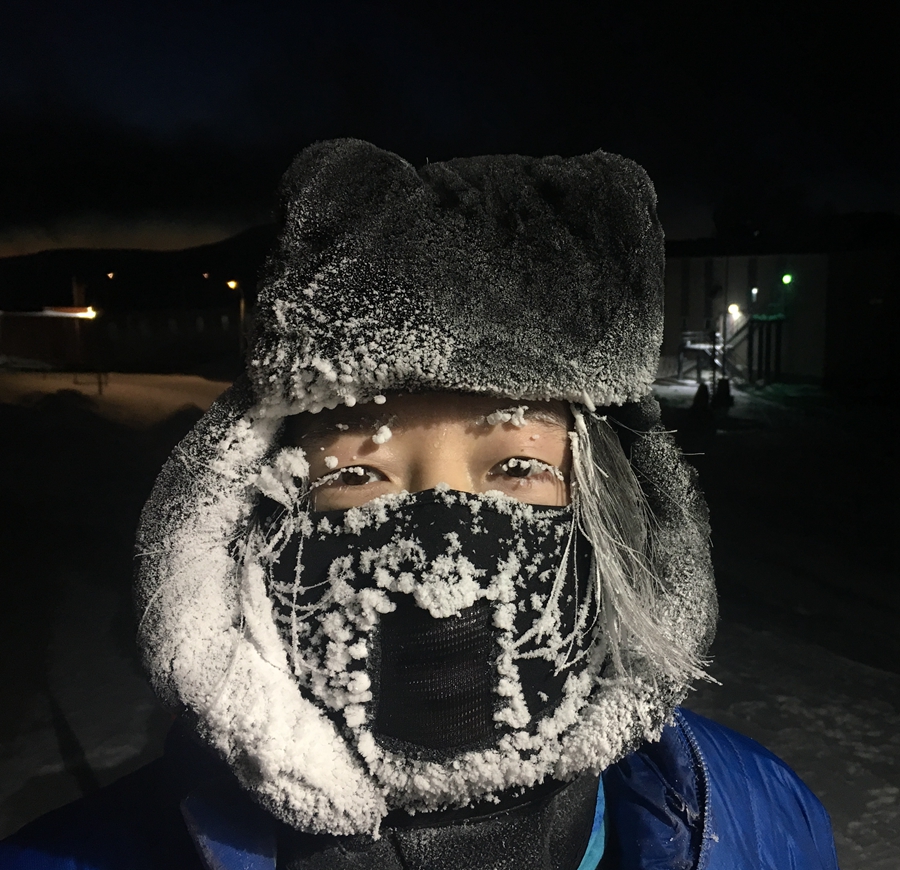 ????外出工作歸來的隊員帽子、口罩和眼睫毛上結了厚厚的霜。當天最低氣溫達到-35.9℃。