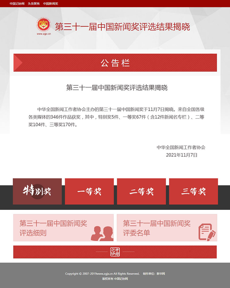 新華社北京11月7日電 中華全國新聞工作者協(xié)會主辦的第三十一屆中國新聞獎評選結(jié)果7日揭曉。來自全國各級各類媒體的346件作品獲獎,其中,特別獎5件、一等獎67件(含12件新聞名專欄)、二等獎104件、三等獎170件。