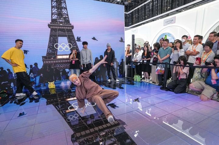 2024年9月14日,在2024年服貿會國家會議中心綜合展區的主賓國法國展臺,中法兩國街舞好手在表演霹靂舞。新華社記者 陳曄華 攝
