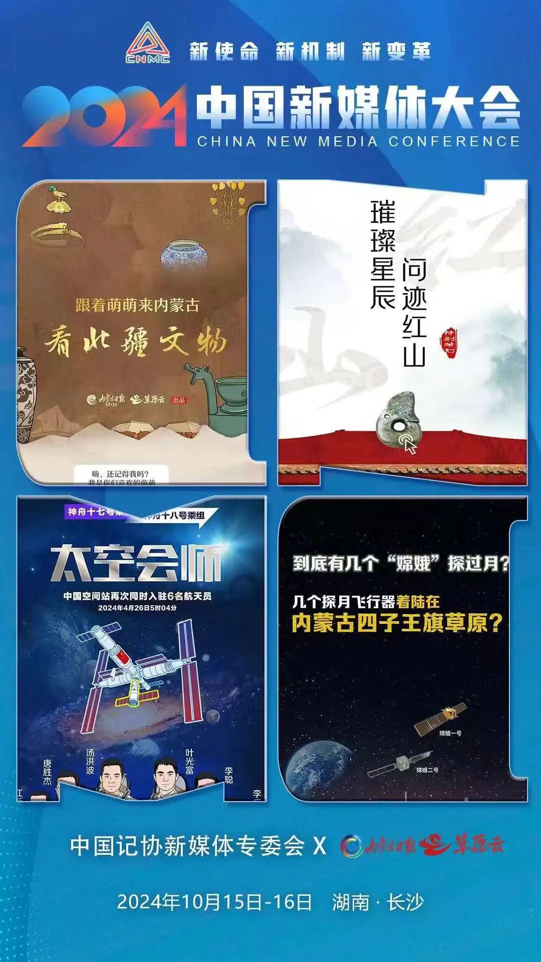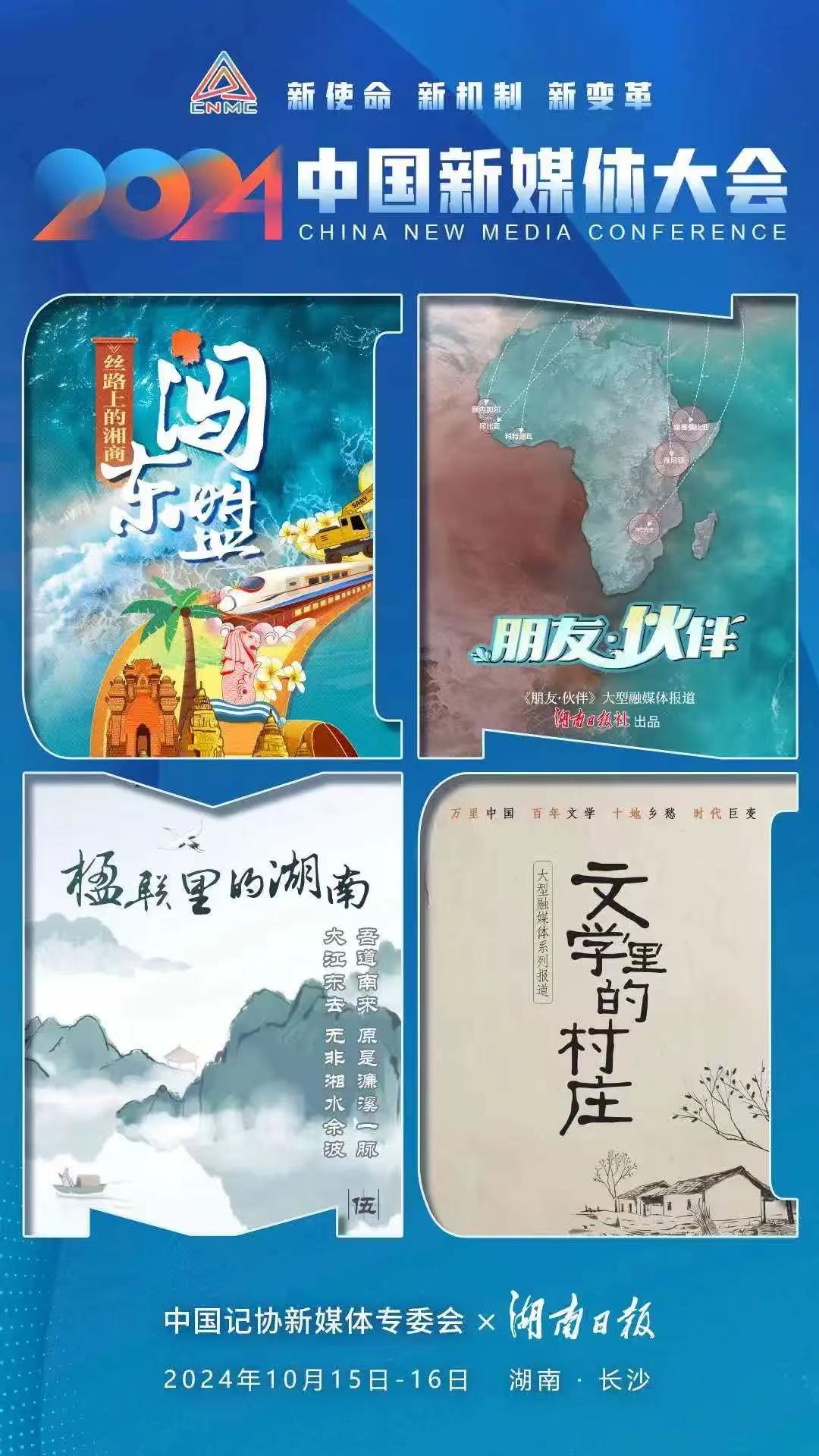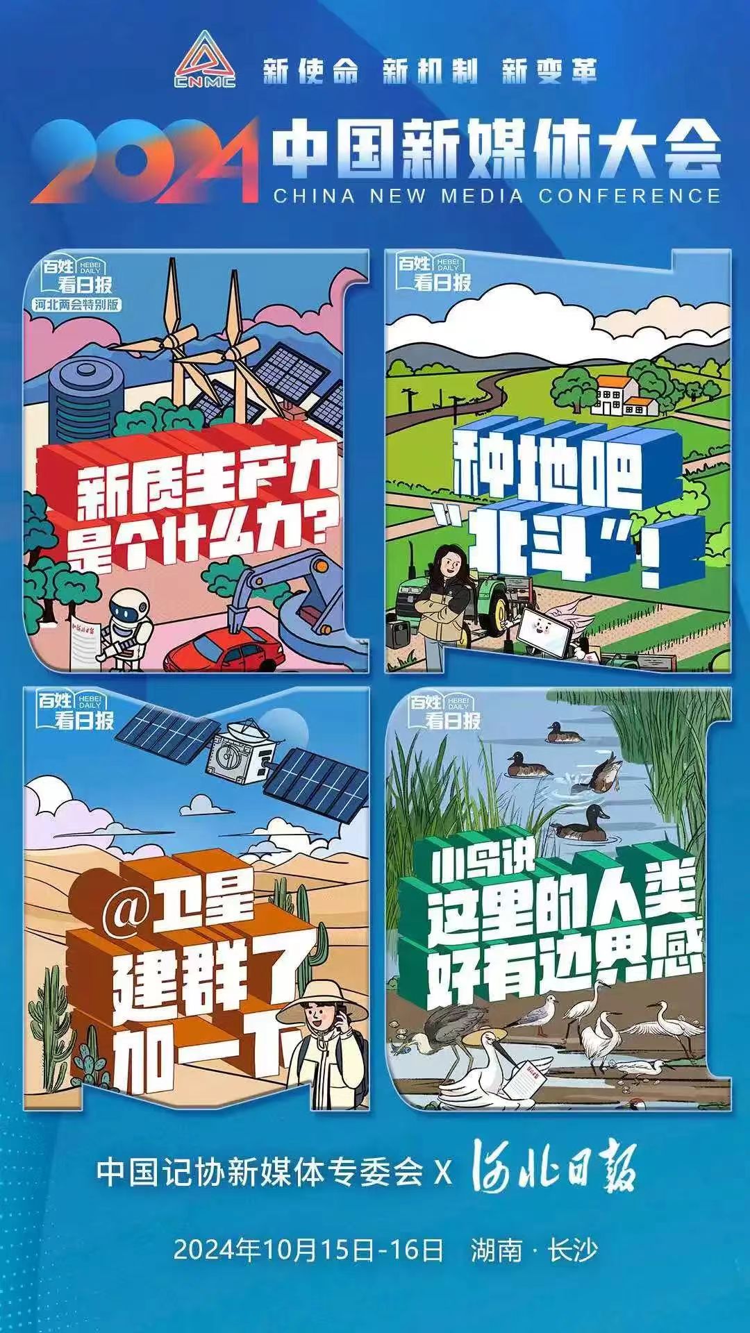 2024中國新媒體大會將于10月15日至16日在湖南長沙召開,中國記協新媒體專業委員會各成員單位紛紛推出“聯名海報”為大會預熱。