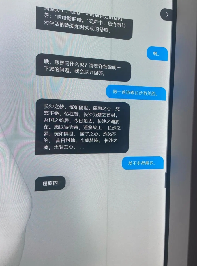 在觀眾提問后,等待了10多秒,“數字屈原”就寫了一首詩:“長沙之夢,恍如隔世。屈原之心,悠悠不絕。憶往昔,長沙為楚之首封,吾國之始居。今日雖去,長沙之魂猶在。”