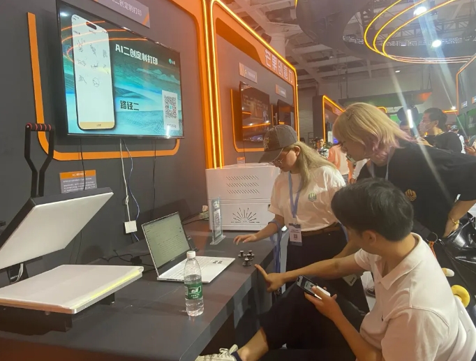 掃描屏幕二維碼,選擇喜歡的文物和元素,就可親手設計一款獨一無二的文創藝術作品,現場打印一件T恤。在湖南廣電展臺,觀眾不僅能欣賞文物細節之美,還能深入探索其背后的歷史與文化故事,沉浸式與文物互動體驗。記者在現場看到,展覽精選三件經典國寶級文物:T形帛畫、商代豕(shǐ)形銅尊、商代青銅皿方罍(léi),通過高精度還原、個性化互動設計,以及多維視覺與聽覺展示,賦予文物新的生命力。現場還可運用自研的中華歷史文化大模型,在保留文物原始紋理輪廓的情況下,實現二次創作,進行“AI二創定制打印”。
